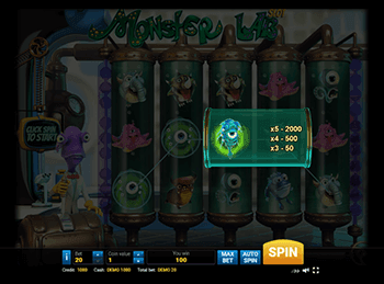 Загляните в таблицу выплат. В ней вы найдете все символы и информацию об их ценности. Как уже упоминалось, практически все картинки слота Monster Lab – разнообразные бактерии. В качестве Дикого символа (Вайлда) выступает решетка ДНК, а Символа разброса (Скаттера) – молекула красного цвета. Она предоставит право на 25 фриспинов. Некоторые получат меньше – 15. Это зависит от количества найденных Скаттеров на мониторе. Все новые игры оснащены бонусной картинкой, которая отправляет в призовую игру на дополнительный экран. На этом слоте функции бонуса выполняет коричневый монстрик с рожками.